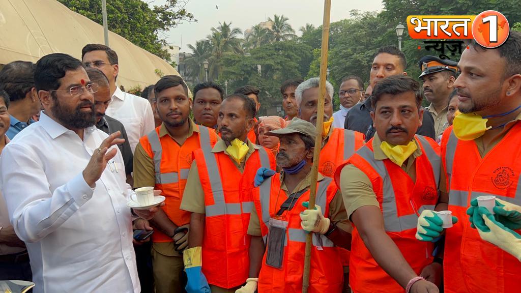 मुख्यमंत्री एकनाथ शिंदे यांनी स्वच्छतेची पाहणी करताना प्रत्यक्ष स्वच्छता करणाऱ्या कर्मचाऱ्यांची भेट घेऊन त्यांच्यासोबत चहापान केले. शासनामार्फत स्वच्छता कर्मचाऱ्यांच्या मुंबईतील सर्व 46 वस्त्यांमध्ये संपूर्ण सोयी सुविधा उपलब्ध करून देण्यात येत असल्याची माहिती त्यांनी कर्मचाऱ्यांना दिली. मुंबई स्वच्छ राखण्यामध्ये आपले महत्वपूर्ण योगदान असल्याचे सांगून त्यांनी कर्मचाऱ्यांचे कौतुक केले.