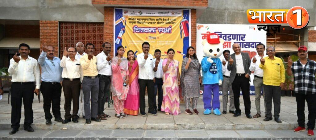 नाशिक महानगरपालिका व क्रेडाई संस्था यांच्या संयुक्त विद्यमाने स्वीप उपक्रमा अंतर्गत चित्रकला स्पर्धेचे आयोजन हुतात्मा अनंत कान्हेरे मैदान (गोल्फ क्लब) येथे करण्यात आले होते.या कार्यक्रमास मनपा प्रशासक तथा आयुक्त डॉ. अशोक करंजकर, उपजिल्हाधिकारी तथा सहाय्यक निवडणूक निर्णय अधिकारी जतिन रहेमान(भा. प्र.से), जिल्हा परिषद मुख्य कार्यकारी अधिकारी तथा स्वीप नोडल अधिकारी अमिशा मित्तल, स्वीप नोडल अधिकारी तथा अतिरिक्त आयुक्त तथा स्वीप नोडल अधिकारी स्मिता झगडे ,उपायुक्त डॉ.मयूर पाटील, सहाय्यक निवडणूक निर्णय अधिकारी तथा तहसीलदार शोभा पुजारी, आंतरराष्ट्रीय दर्जाचे चित्रकार राजेश सावंत,विभागीय अधिकारी राजाराम जाधव,योगेश रकटे,मदन हरिश्चंद्र,तुषार आहेर,सुनीता कुमावत, कैलास दराडे,नितीन गंभीरे,उद्यान विभागाचे उद्यान निरीक्षक आदी प्रमुख मान्यवर या स्पर्धेच्या कार्यक्रमास उपस्थित होते.